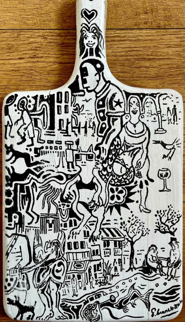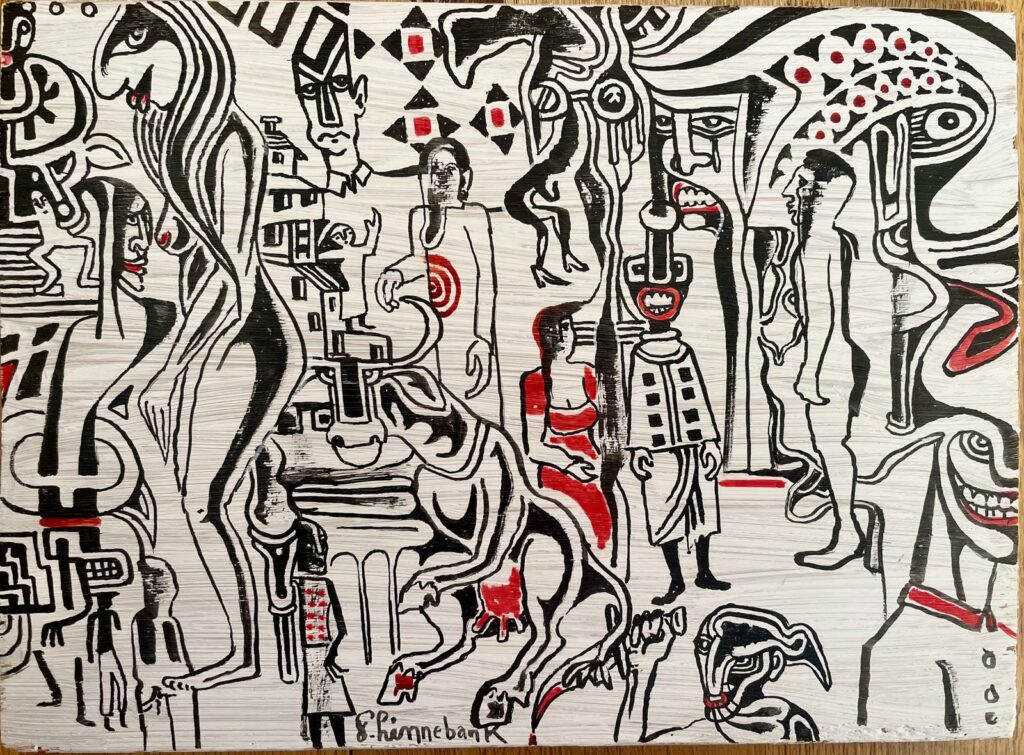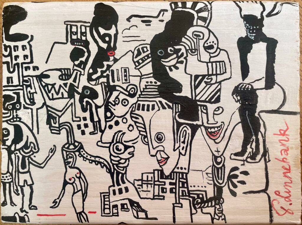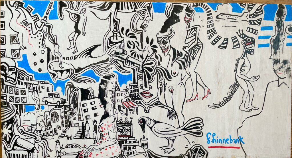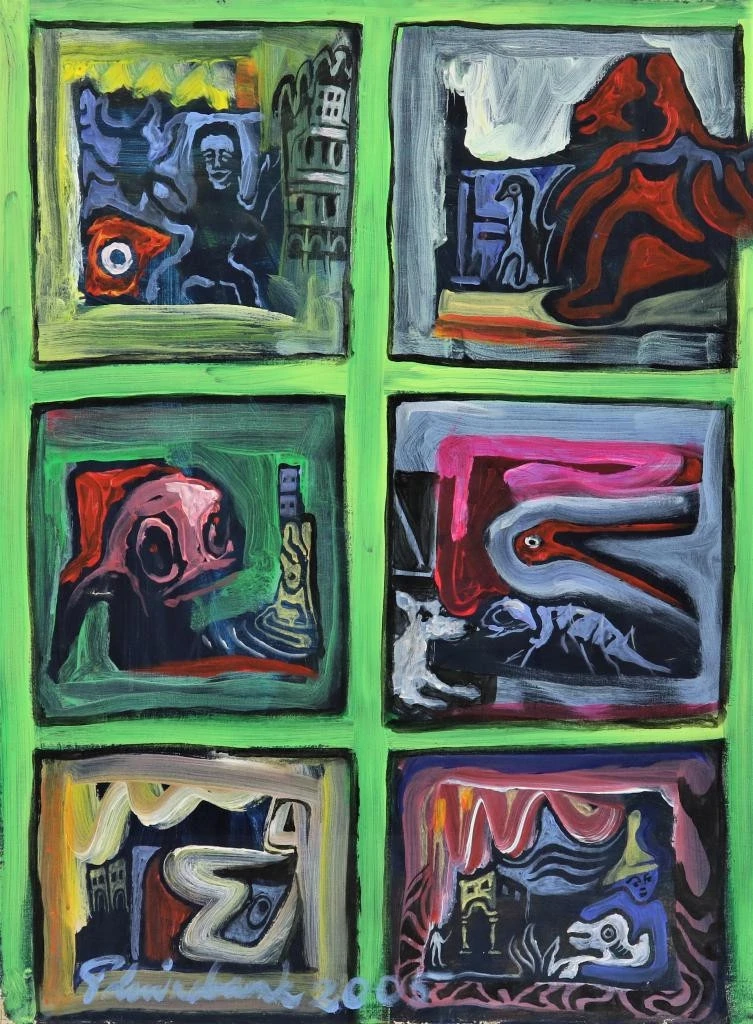 I never knew at the beginning of a drawing or painting what was going to emerge. I didn’t want to know – I still don’t. That was the whole fun, the adventure of it. Through the years I taught myself to draw with recognizable elements. A bit like a writer agrees with himself to write with real words and logical sentences, to make sense to himself and his audience. I also taught myself to master paints and brushes, to get to know them and to learn how to use them to best advantage, in a childlike way, discovering the possibilities the way they presented themselves while I was experimenting. So, slowly, I developed a personal language of shapes. I am still playing and discovering.