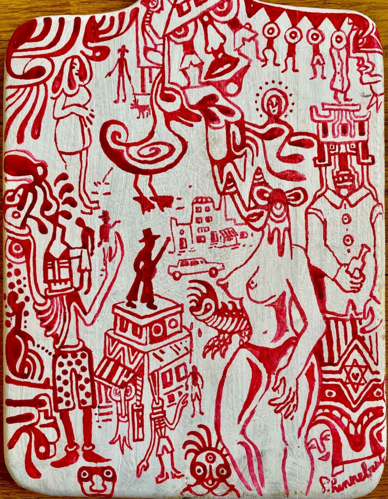 I love to look at my paintings. I see all kinds of animals, birds, fish, reptiles, dogs and insects. Or cars, houses and geometric shapes. Or sentences – mostly sentences of songs that are in my head while I am painting. Or things people say in my personal life or in the media. But mostly I see humans. Naked people, partying people, suffering people, babies, soldiers, men and women. And of the people it is their face and all their facial expressions that I enjoy painting and looking at. It is the human face that feels the most like it is painting itself.