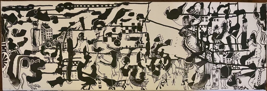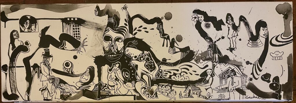 The technical level of these artworks is quite sophisticated. Although they may initially appear chaotic due to the dense and abstract nature of the compositions, closer examination reveals a deliberate and skilled approach to line work, contrast, and spatial arrangement. Linnebank’s use of ink demonstrates a confident command of the medium, where every stroke and detail contributes to a complex interplay between order and disorder. The precision in the rendering of figures, architecture, and other elements suggests that while the work embraces surreal, dreamlike themes, it is underpinned by a high level of technical mastery and thoughtful composition.