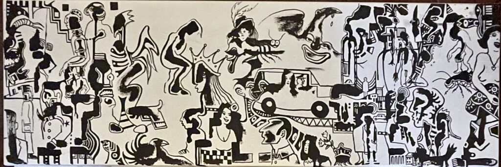 These paintings by Piet Linnebank exhibit a surreal style, utilizing black ink or paint on a white background. The compositions are dense and chaotic, filled with fragmented and intertwined figures, faces, animals, and architectural elements.